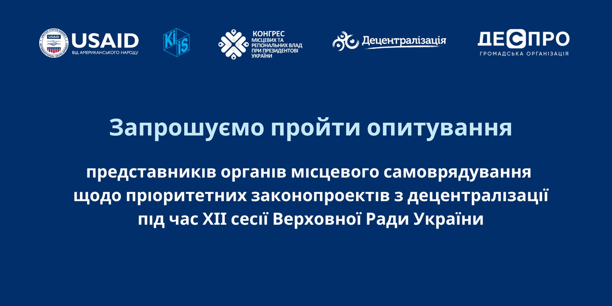 Опитування проводить Київський міжнародний інститут соціології на замовлення громадської організації «ДЕСПРО» за підтримки Проєкту USAID «ГОВЕРЛА» та у партнерстві з Офісом Конгресу місцевих та регіональних влад при Президентові України, щоб дізнатися позицію керівництва органів місцевого самоврядування щодо пріоритетів розгляду законопроектів, які стосуються їхньої діяльності, Верховною Радою України під час 12 сесії.