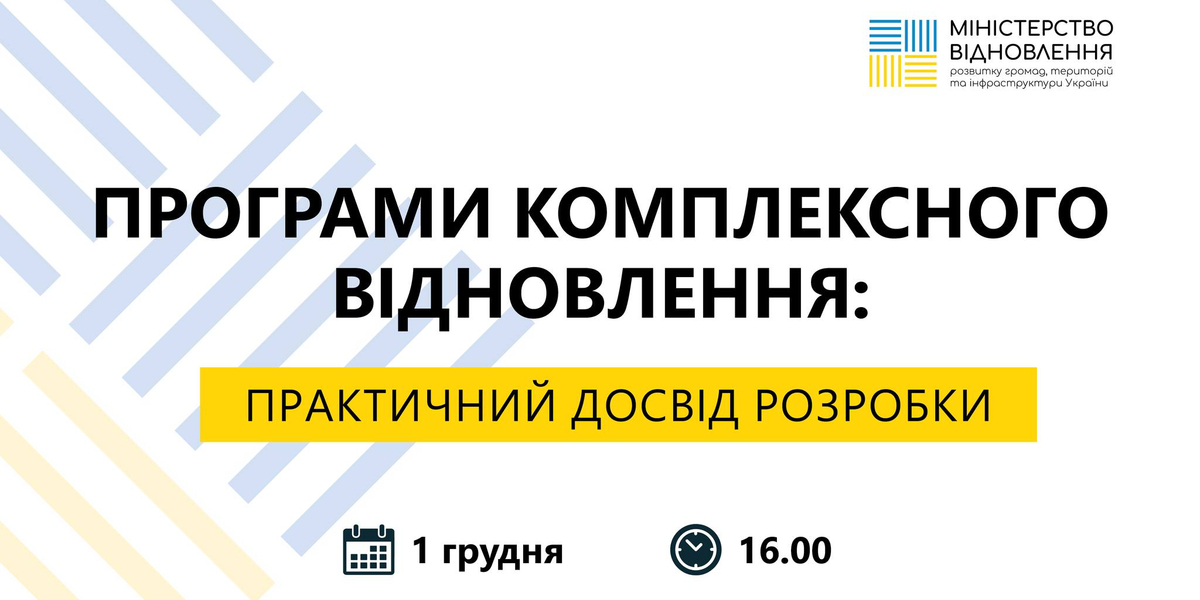 Що потрібно громадам для відбудови? Як громадам правильно планувати відновлення на найближче майбутнє? Куди і як подаються проєкти відновлення? Відповіді на ці питання 1 грудня 2023 року о 16:00 дадуть учасники обговорення «Програми комплексного відновлення: практичний досвід розробки».